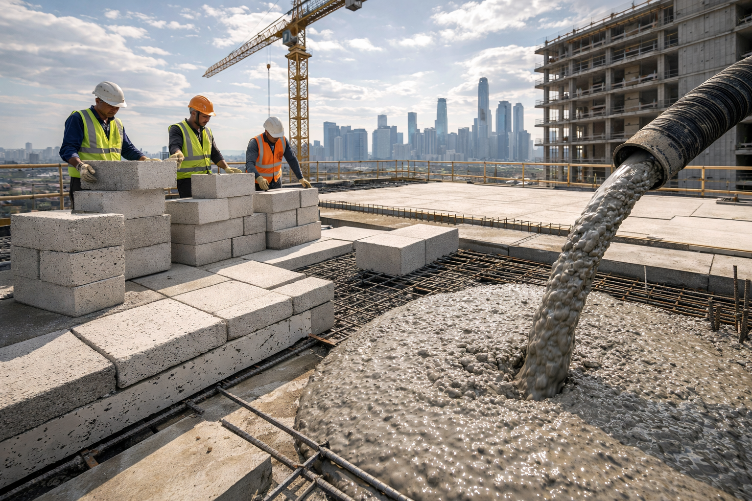 Lightweight concrete is produced using lightweight aggregates to reduce the overall dead load of structures. It improves thermal insulation, enhances seismic performance, and makes construction easier to manage. Commonly used in high-rise buildings, rooftops, and commercial structures, lightweight concrete offers better energy efficiency, reduced foundation load, and improved structural safety.